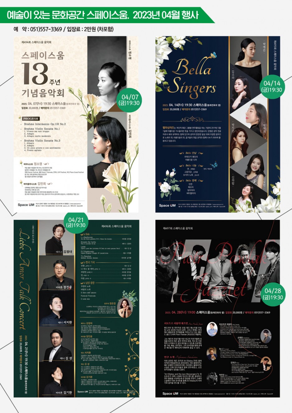 스페이스움 카테고리 단체정보공연장갤러리열린 분류 기타정보 본문 알차게 준비한 스페이스움 4월 행사입니다. 목록 이전글스페이스움 6월 행사 일정표입니다 23.06.01 다음글스페이스움 2023년 03월 행사안내 23.02.28