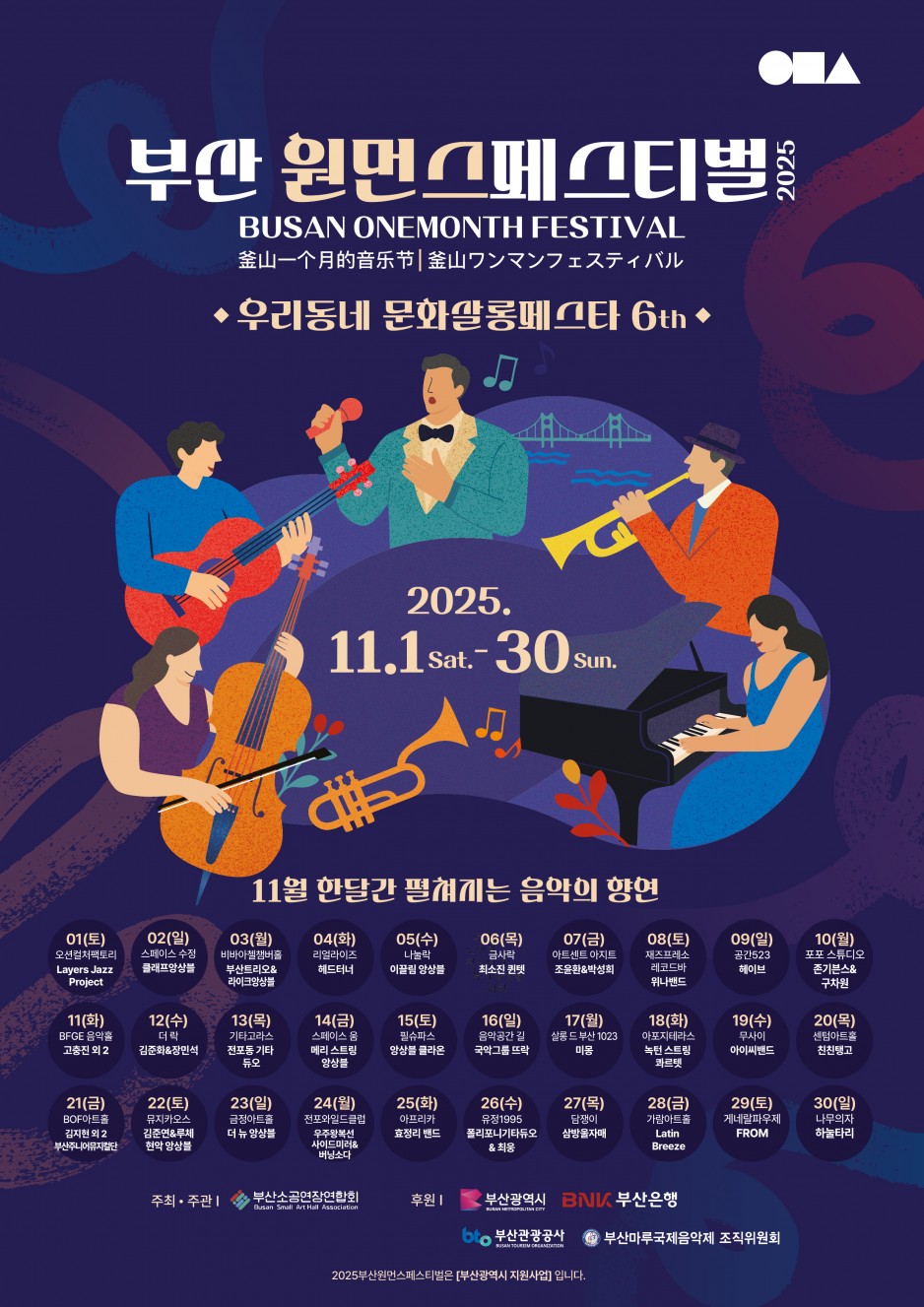 우리의 일상과 맞닿아 있는 부산의 각 지역에 위치한 우리 동네 소공연장에서 클래식, 재즈, 국악, 인디 등 다양한 장르의 음악을 들을 수 있는 일상만족 프로젝트, 2025 부산원먼스페스티벌 <우리동네문화살롱페스타>가 6월에 이어 11월에도 여러분들을 찾아갑니다.