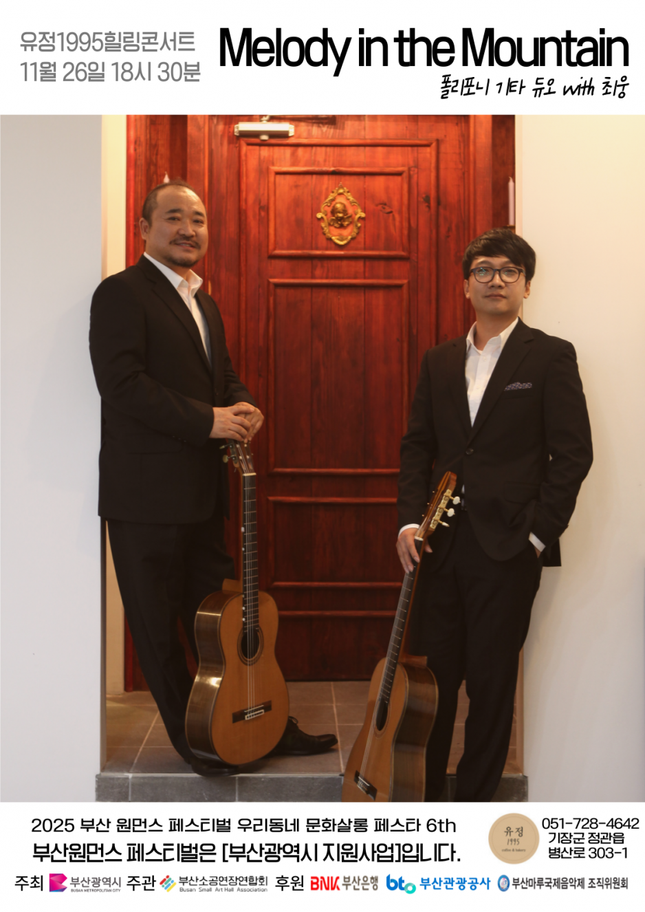 - 가을에 어울리는 서정적이고 풍부한 감성의 곡들로 깊은 울림을 선사하며, 게스트 연주자 최웅은 독주와 함께 3중주 협연, 그리고 특수악기 (Guitar Ron) 으로 독창적인 무대를 더 할 예정입니다. 클래식, 영화음악, 남미음악 등 다양한 장르의 작품을 선보일 예정이며, 계절의 정취와 어우러지는 이번 무대는 관객들에게 새로운 감동으로 찾아뵙겠습니다.