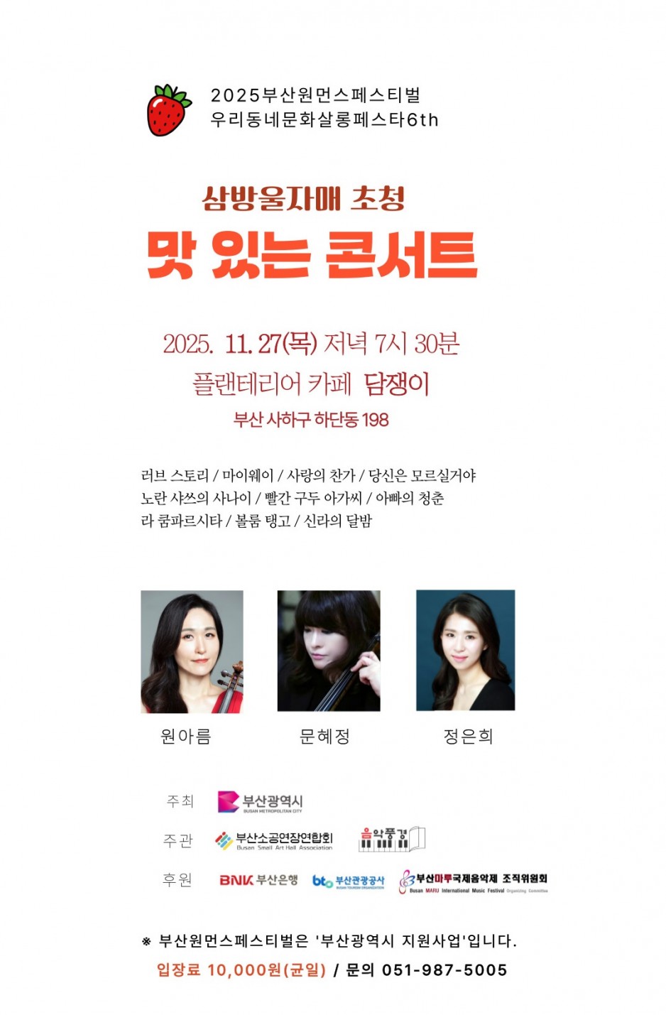 - 가요, 클래식, 팝,탱고 등을 편·작곡해서 연주하는 삼방울자매는 누구나 쉽고 즐겁게 음악에 접근할 수 있는 계기를 제공합니다. 삼방울자매와 다양한 장르를 넘나드는 클래식 무대를 즐겁게 감상하시길 바랍니다.