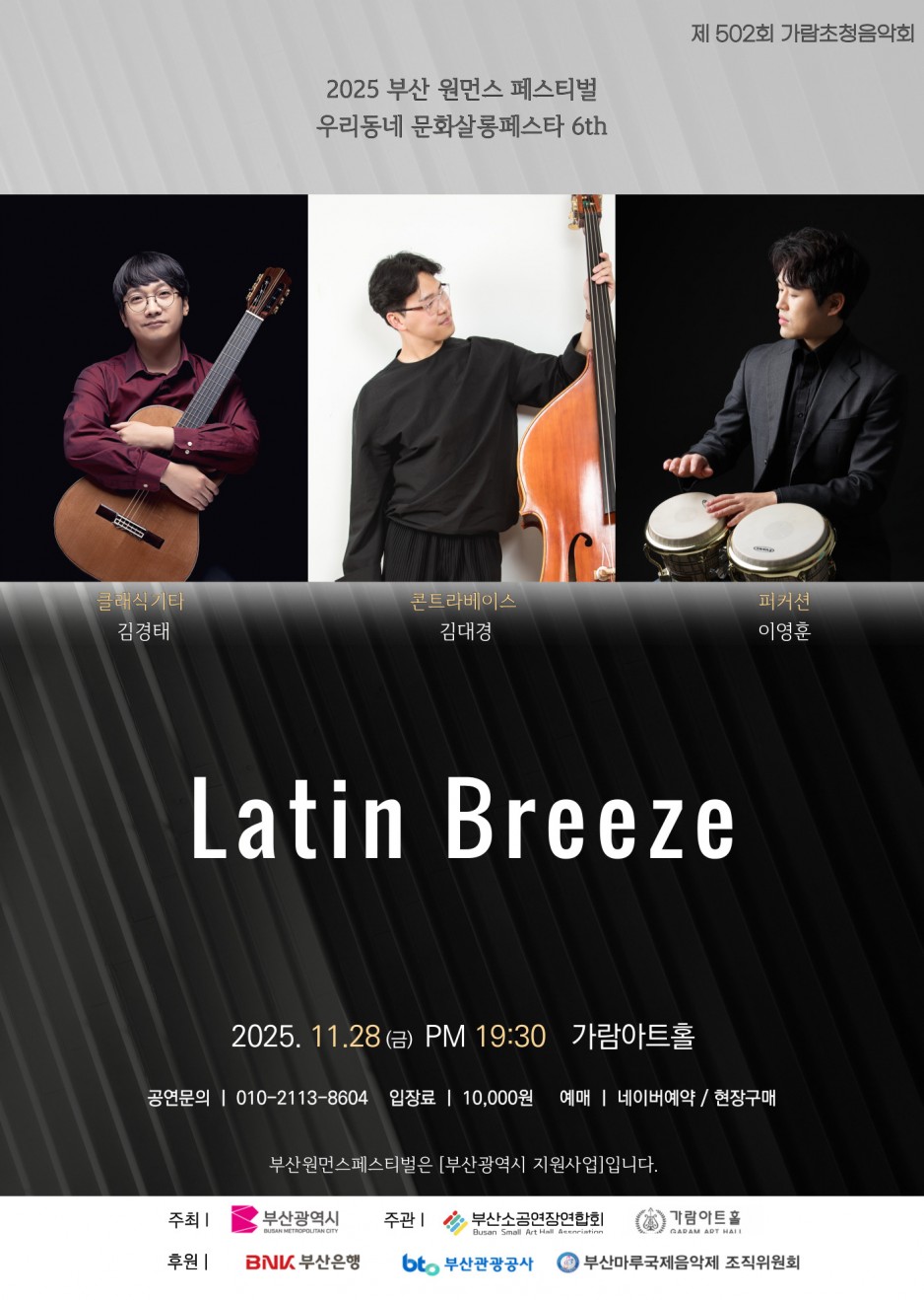 - 기타와 콘트라베이스, 퍼커션이라는 독특한 편성은 리듬과 멜로디, 하모니의 균형을 섬세하게 살리면서도 기존 클래식 기타 공연과는 차별화된 다채로운 사운드를 선보입니다. 클래식과 월드뮤직의 경계를 허물고 하나로 어울러지는 열정의 라틴음악에 빠져보시길 바랍니다.