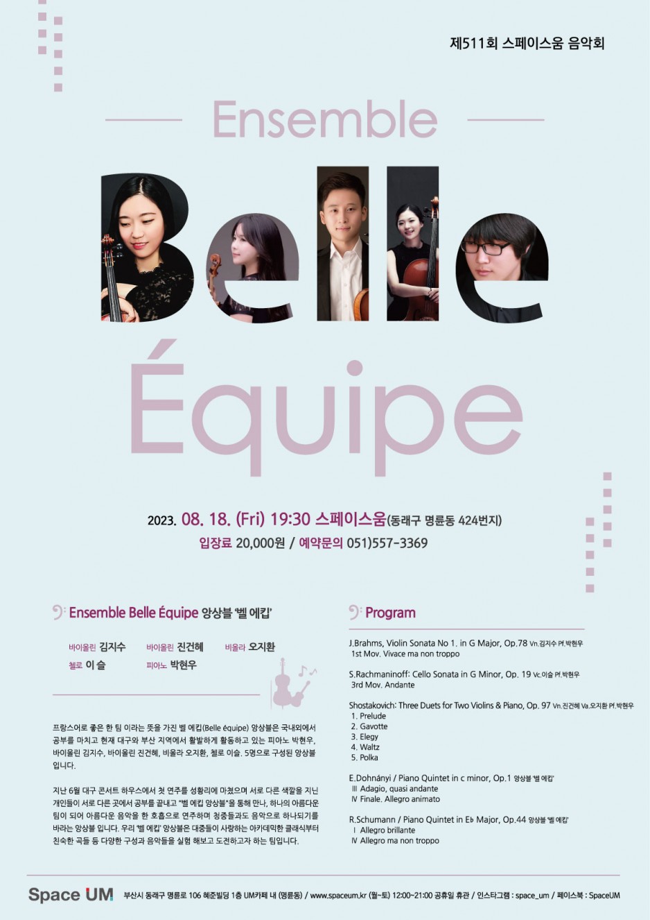 프랑스어로 좋은 한 팀 이라는 뜻을 가진 벨 에킵 (Belle équipe) 앙상블은 국내외에서 공부를 마치고 현재 대구와 부산 지역에서 활발하게 활동하고 있는 피아노 박현우, 바이올린 김지수, 바이올린 진건혜, 비올라 오지환, 첼로 이슬. 이렇게 5명으로 구성된 앙상블 입니다.