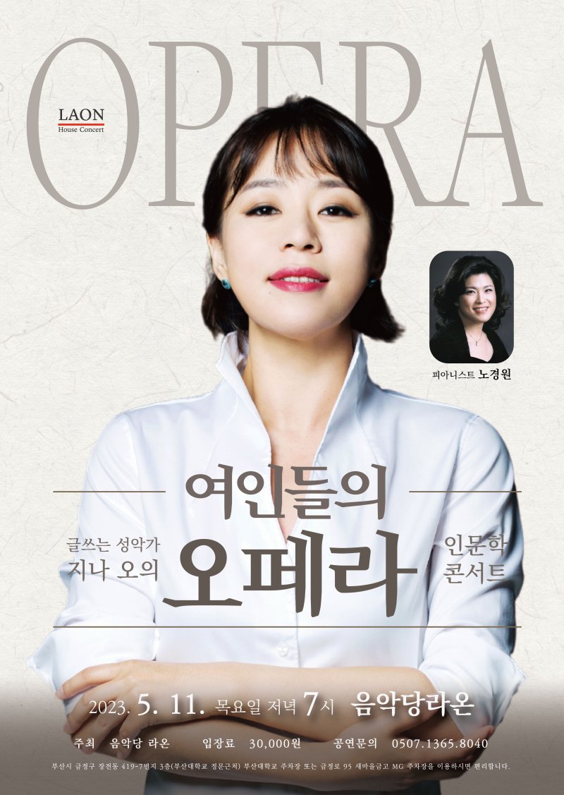 신간 '오페라의 여인들' 발간을 맞이해 고국을 방문한 지나 오는 부산에서 다양한 이벤트로 독자들을 만날 계획이다. ▲오는 11일 오후 7시에는 '음악당 라온' ▲12일 오후 7시 30분에는 '스페이스 움'에서 독자 및 관객과 소통하는 자리를 마련한다. 이번 공연의 반주는 김해 국제 음악제 위원장인 피아니스트 노경원(인제대 교수)이 맡았다.