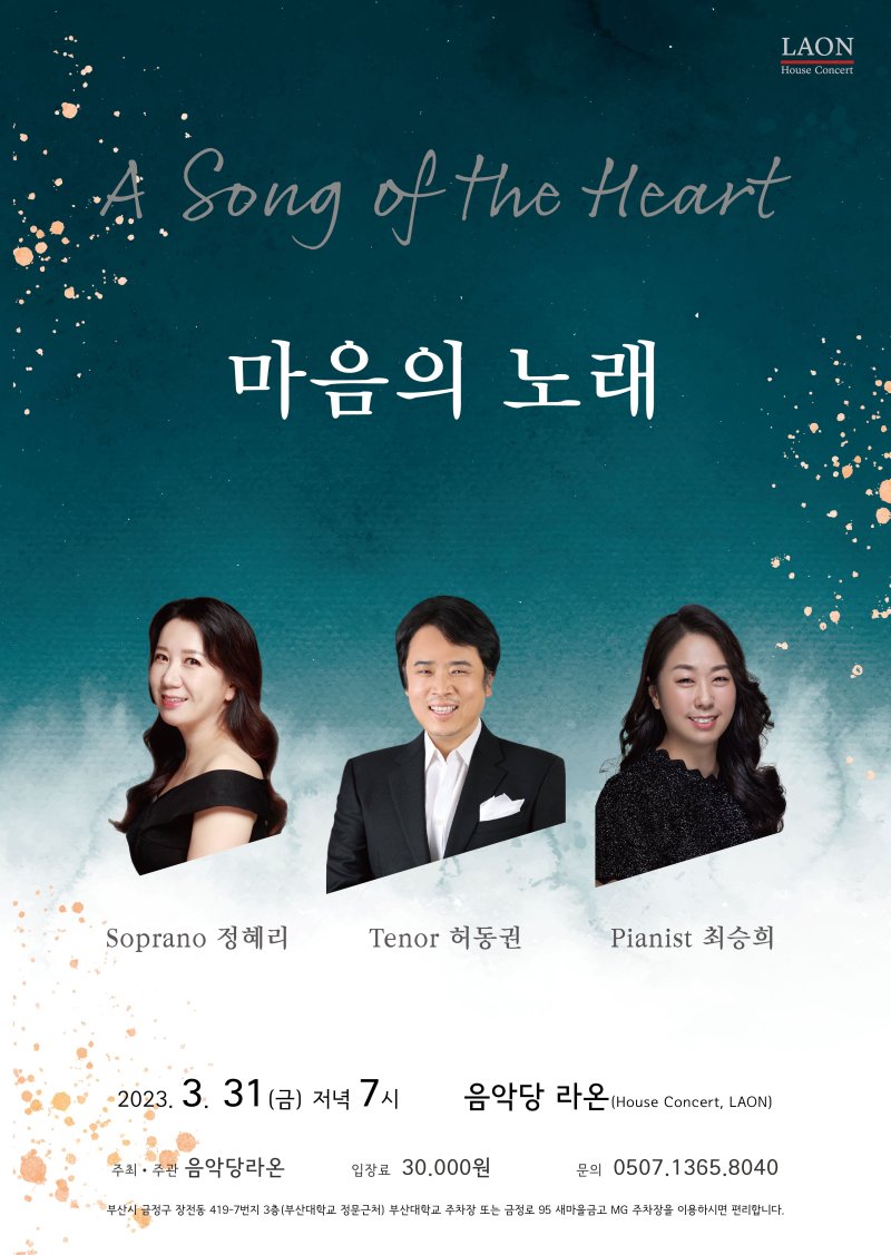 테너 허동권, 소프라노 정혜리, 피아니스트 최승희님의 ‘마음의 노래’ 입니다. 한국가곡과 이태리, 프랑스 가곡 뿐만 아니라 오페라 아리아까지 멋진 두 성악가분께서 다양한 곡들을 들려주신다고 하니 많은 관심 부탁드립니다.