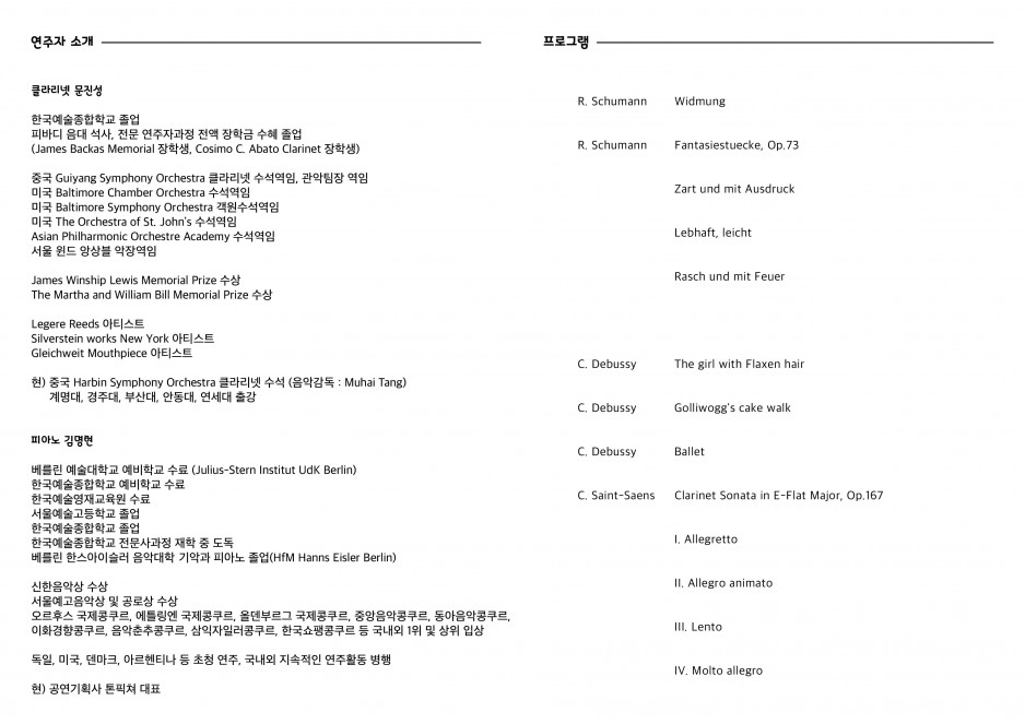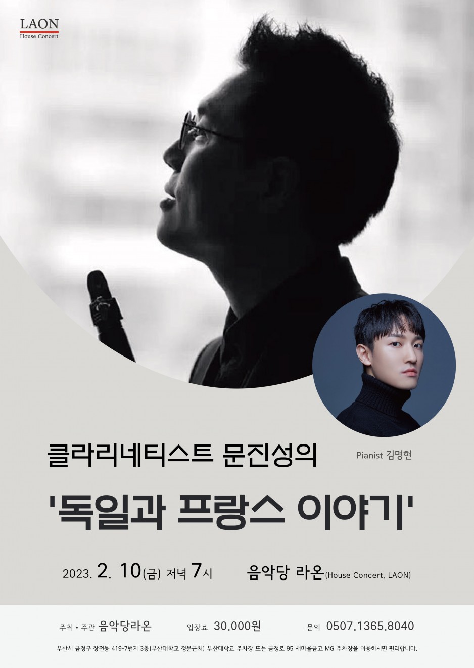‘독일과 프랑스 이야기’ 로 꾸며질 이번 연주는 중국 하얼빈 심포니 오케스트라의 클라리넷 수석으로 계시는 문진성님과 베를린 한스아이슬러 음악대학을 졸업하신 피아니스트 김명현님이 준비해주셨습니다. 클라리넷의 낭만적인 선율이 라온에 따뜻하게 울려퍼지길 바라며 올해 첫 연주를 시작합니다^^ 슈만과 드뷔시, 생상의 작품들로 준비되어 있으니 많은 관심 부탁드립니다.